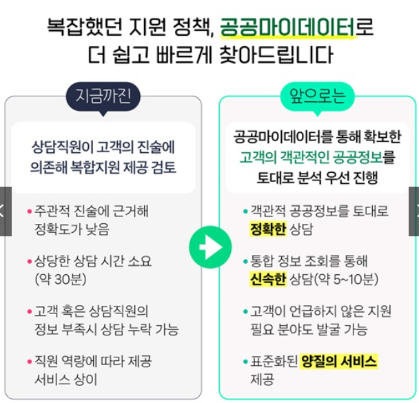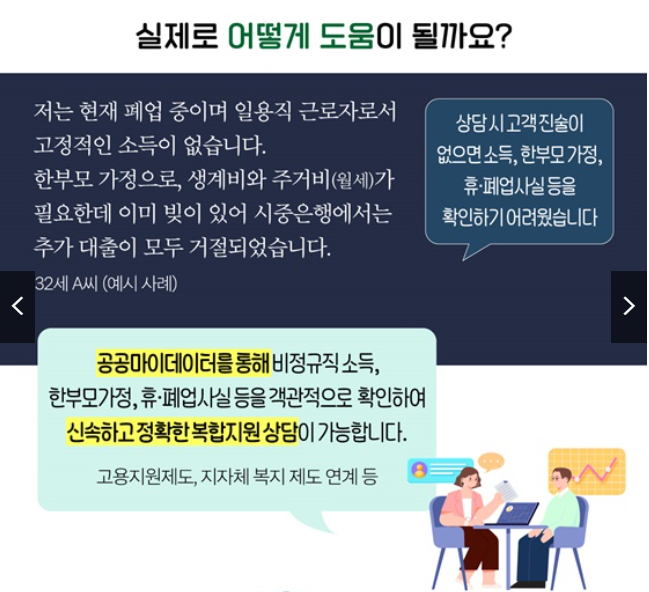 하지만 공공 마이데이터를 활용하면, 상담원이 A씨의 동의를 얻어 관련 행정정보를 즉시 조회할 수 있습니다.